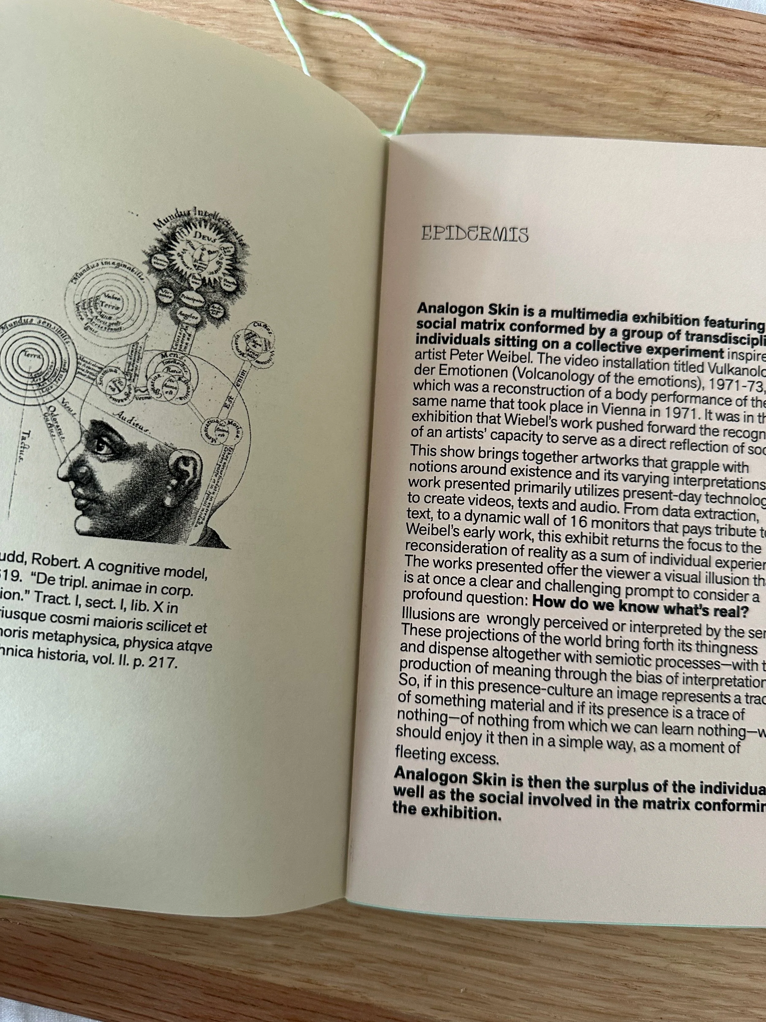 Analogon Skin is a multimedia exhibition structured around a social matrix formed by a collective of transdisciplinary individuals engaged in a collaborative experiment. This project draws inspiration from Vulkanologie der Emotionen (Volcanology of the Emotions), a video installation by artist Peter Weibel (1971–73), itself a reconstruction of a body performance originally staged in Vienna in 1971. It was through this work that Weibel underscored the artist's role as a direct mirror of society.